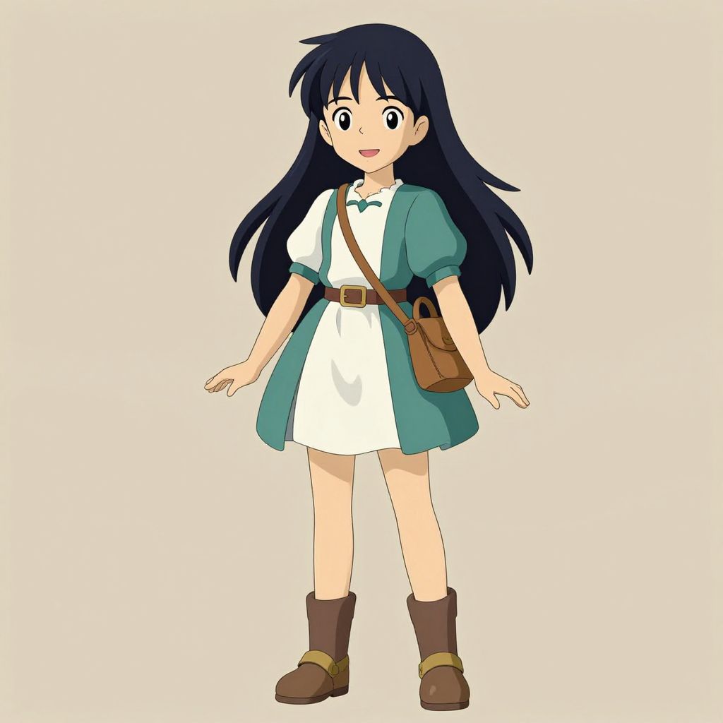 Digital anime-style drawing of a young girl with long, dark blue hair and large, expressive eyes. She wears a white, short-sleeved dress with a teal cardigan, a brown belt, and a brown satchel slung across her chest. Her outfit is completed with brown boots. The girl stands with a slight smile and her arms slightly out to the sides. The background is plain white, making the character the sole focus of the image. The art style is clean and vibrant, with bold outlines and flat colors.
