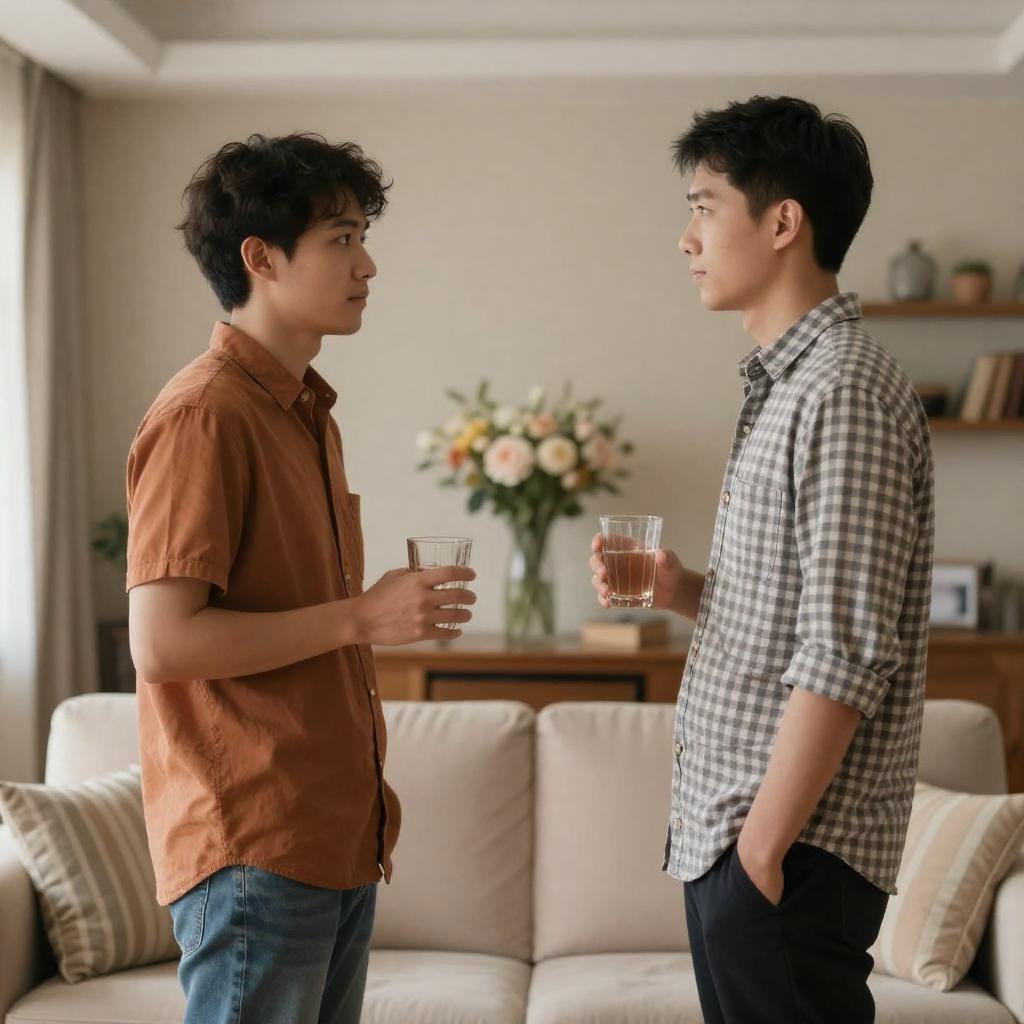 Two men at a red-checkered table in a busy restaurant. The man on the left, with short dark hair and a light blue shirt, looks intently at the man on the right, who has short dark hair, a black shirt, and points with his right index finger. Both have glasses of beer in front of them. Background: blurred restaurant patrons and decorative elements.