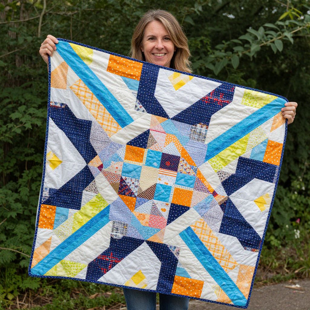 Smiling woman proudly showcasing a vibrant geometric rag quilt featuring colorful diagonal lattice patterns, polka dots, and fat quarter fabric pieces, set against a lush green outdoor backdrop.
