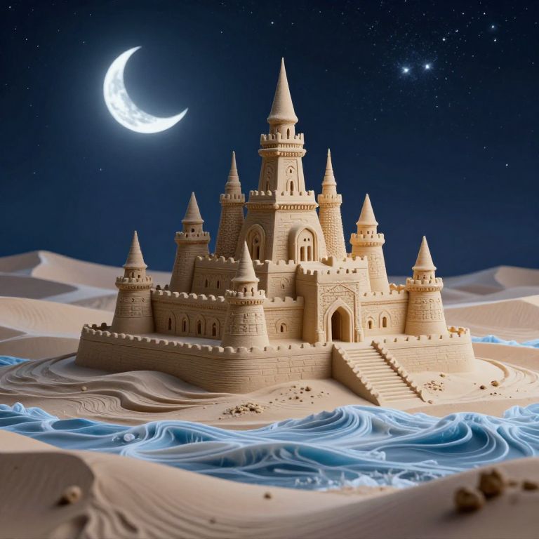 A mesmerizing 3D-rendered fantasy landscape features intricately sculpted sandcastles under a starry night sky, illuminated by a crescent moon, evoking the ethereal presence of ghostly architects crafting their midnight masterpieces amidst wind-sculpted dunes that mimic the undulating patterns of frozen oceans.