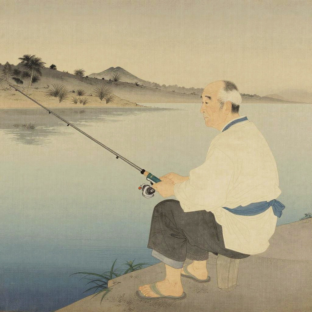 Realistic photo.A painting of an elderly man fishing by a lake in Traditional Japanese art, featuring serene expressions, delicate brushwork, and a tranquil atmosphere, realistic yet expressive with a touch of surrealism realistic photo