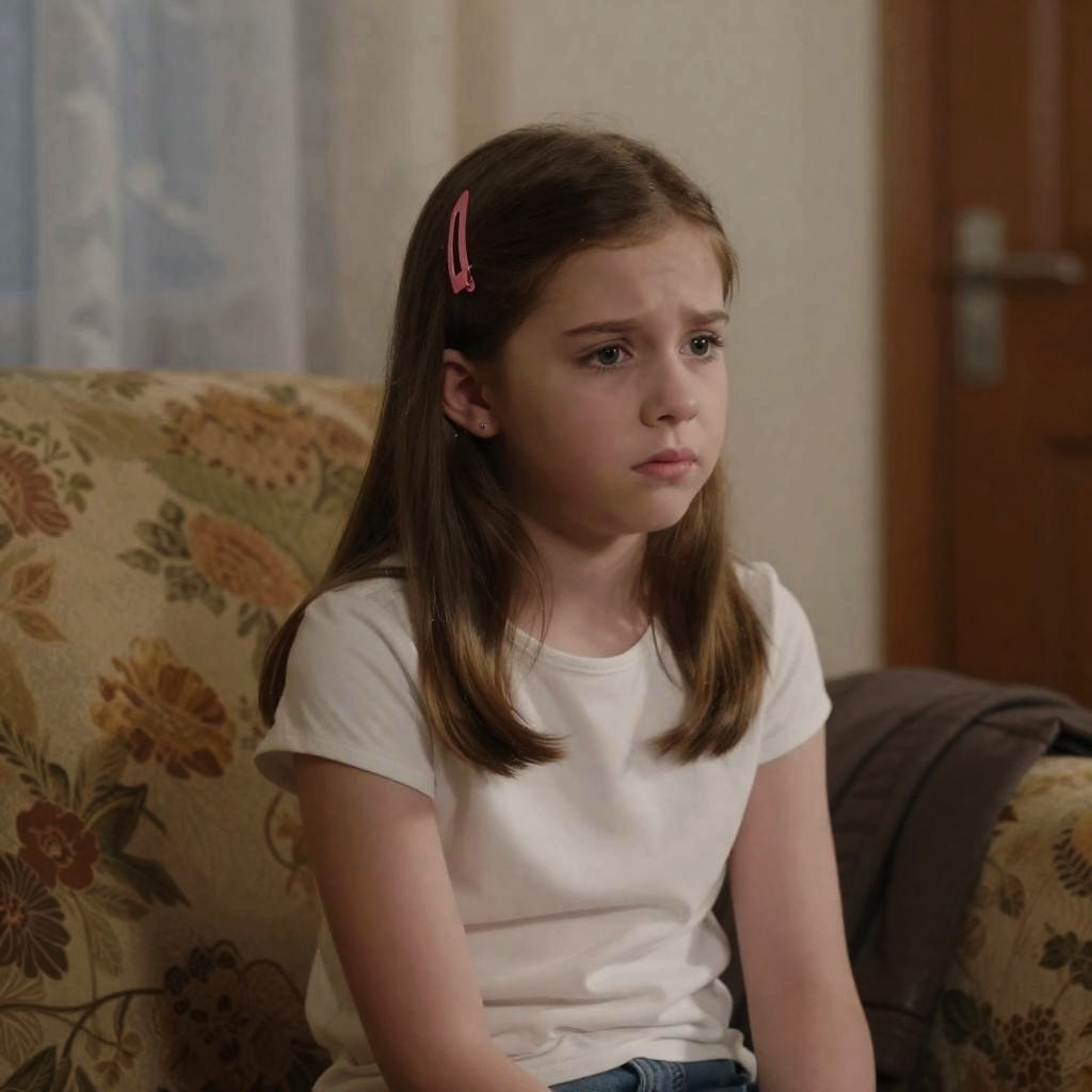 Photograph of a young blonde girl with a black hairclip, upset expression, eyes closed, facing another person with dark hair, blurred. Background includes a lamp, blurred objects on a shelf. Indoor setting, dim lighting. Two people.