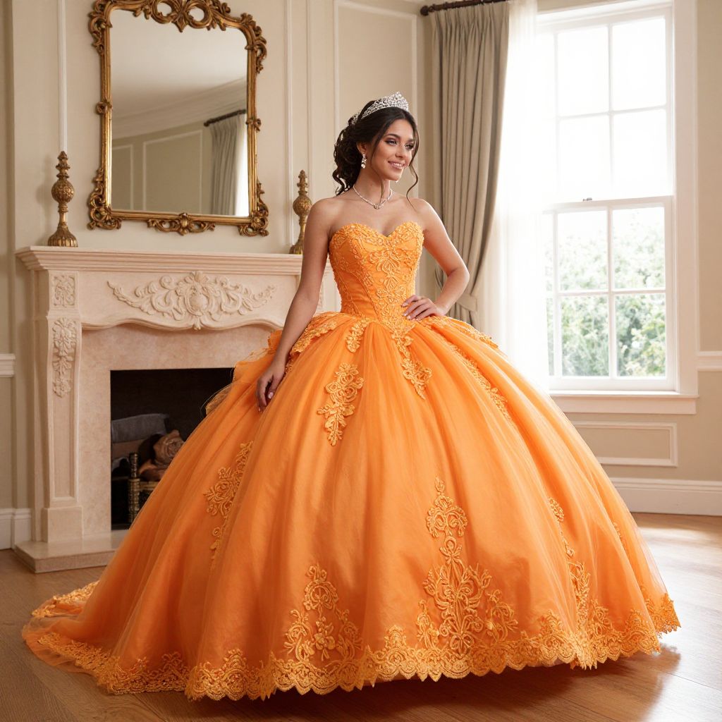 Photograph of a beautiful woman with dark hair, wearing an elaborate, vibrant orange lace ball gown and tiara, standing in a sunlit, elegant