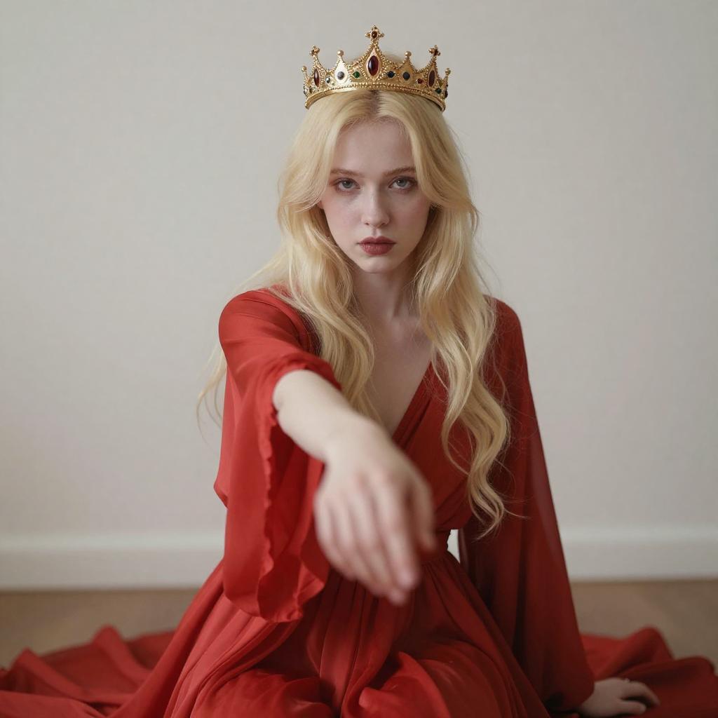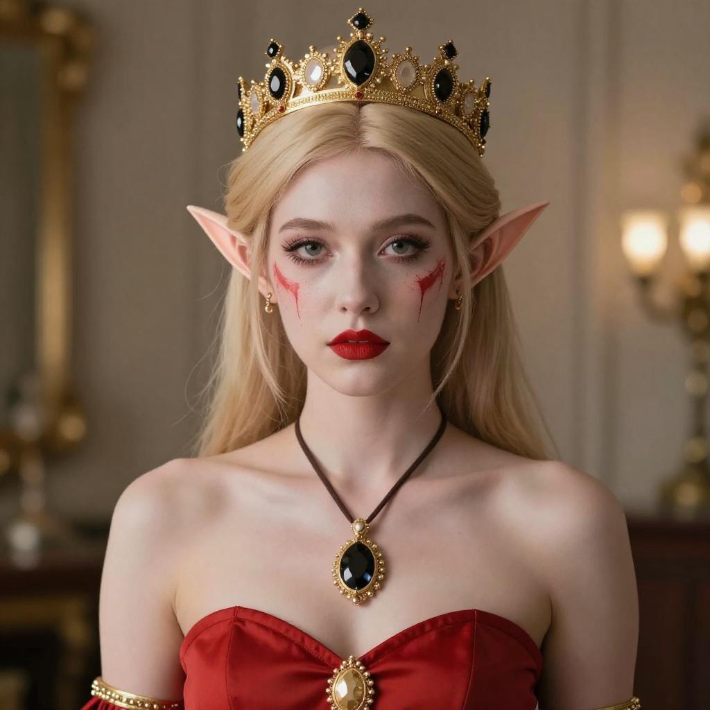 Photograph of a young woman with pale skin and blonde bob haircut, wearing a gold crown with black and red accents, red face paint with white star shapes, and a red, sleeveless, ruffled top. She has pink lipstick and pointed elf-like ears. The background is a softly lit, gradient sky transitioning from white to orange.