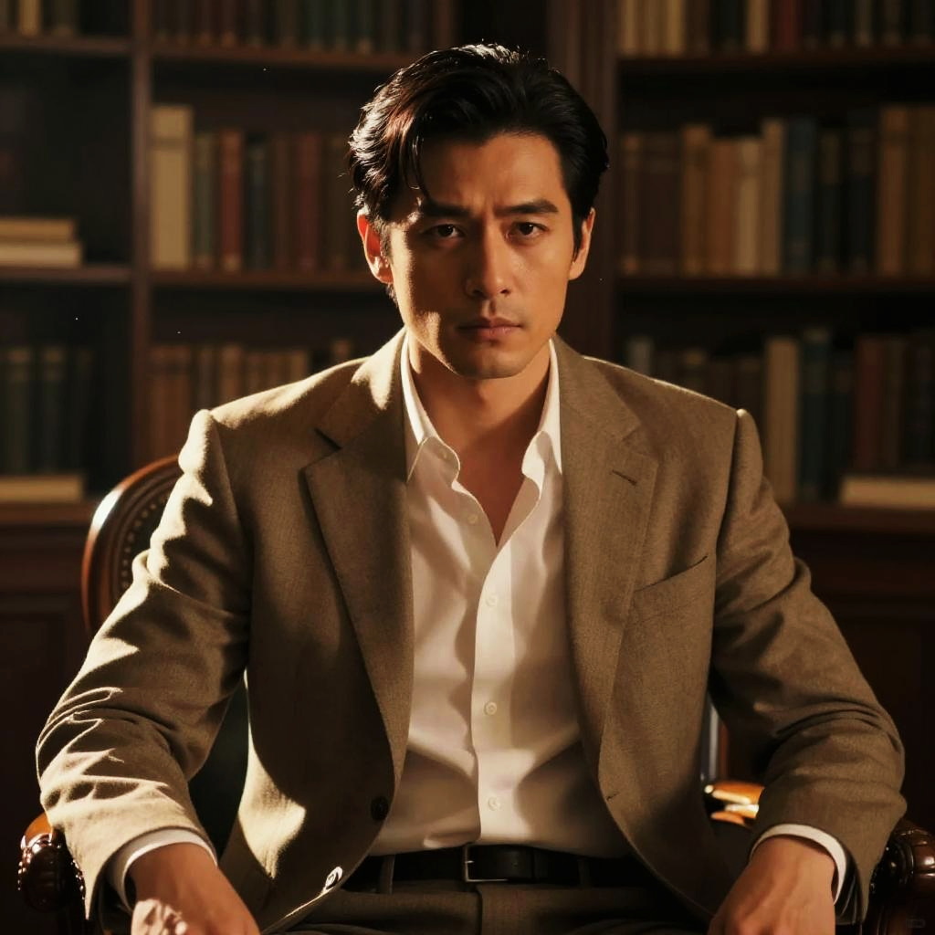 (masterpiece:1.1), best quality, (photorealistic:1.2), hyperrealistic, award-winning portrait of adult man, jet black hair slicked back, intense gaze, upper body, expressive eyes, slim wai BREAK 1.1, wide hips:1.1, athletic-curvy build, wind-swept hair, sitting in antique bookstore with warm lighting, wearing button-up shirt and blazer, golden hour glow, dappled light, soft particles in the air, 8k, highly detailed, broad lighting, chromatic aberration, subtle film grain, ray tracing, octane render, soft bloom