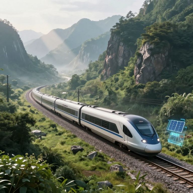 A digital illustration of a sleek, modern high-speed train with a white and blue color scheme traveling through a lush, mountainous valley. The train curves along a railway track surrounded by dense greenery and tall cliffs. Sunlight filters through the misty mountains in the background, creating a serene atmosphere. A blue electronic sign is visible on the right side of the track. The foreground features vibrant green foliage, and the train's windows reflect the natural scenery. The image has a hyper-realistic style with detailed textures and vivid colors, emphasizing the contrast between the advanced technology of the train and the natural beauty of the landscape.