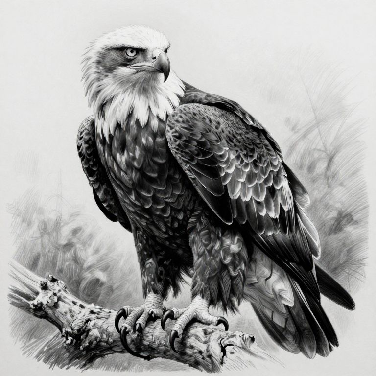 Monochrome digital drawing of a detailed, fierce bald eagle perched on a textured branch, showcasing intricate feather patterns and intense gaze.