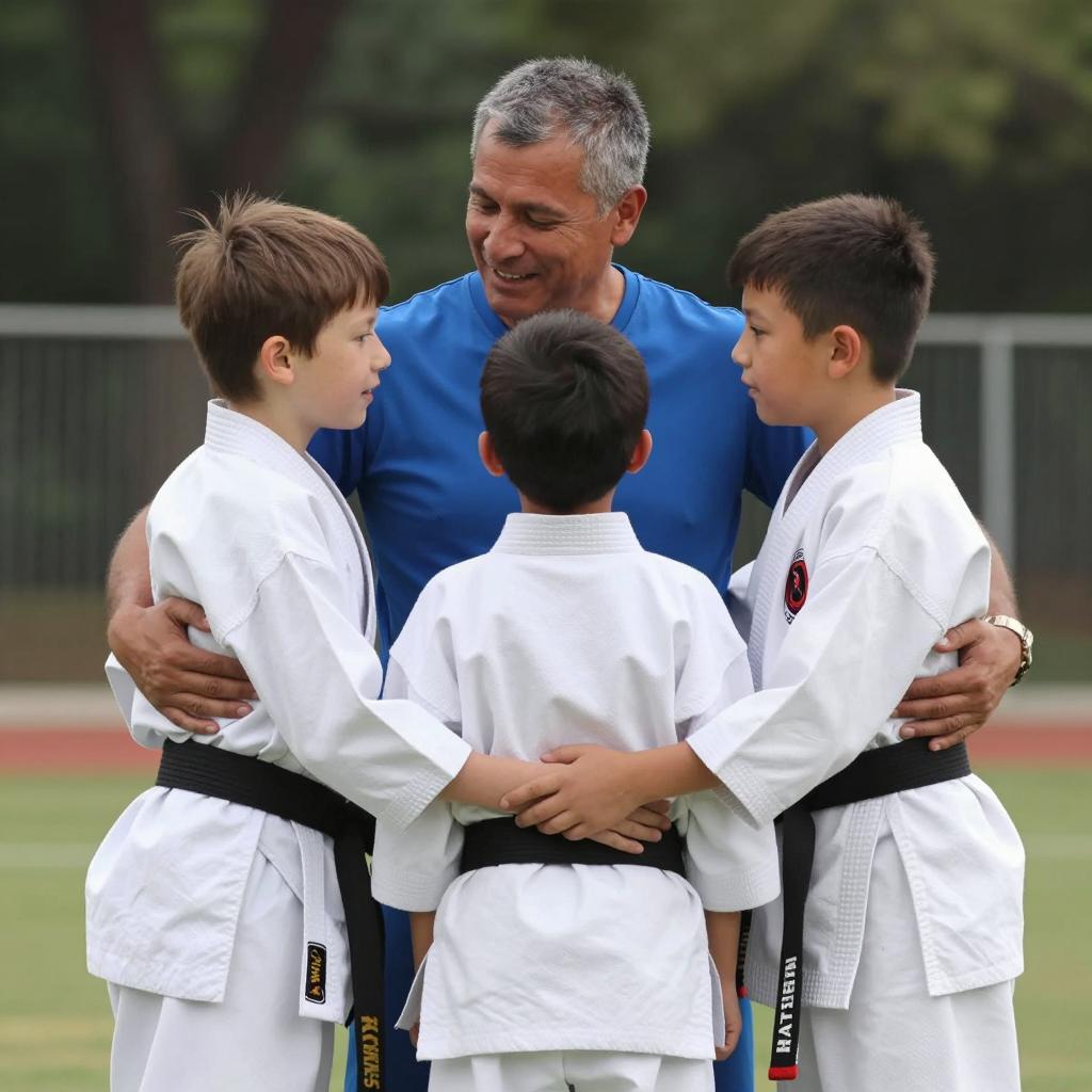 A photograph of a muscular, middle-aged man with a beard, wearing a blue tank top, being pulled by two children. The children, one in a green shirt and another in a blue shirt and cap, laugh and pull his ears. The man's face shows a wide, intense laugh. Two yin-yang symbols are on the dark background. Three people, one with head down, visible.