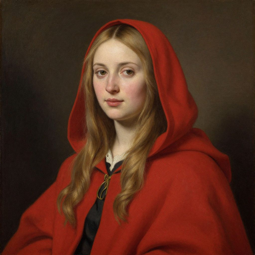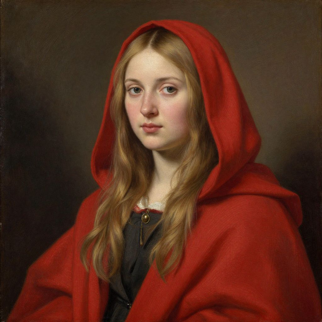 A portrait-style oil painting featuring a young woman with long blonde hair, wearing a vibrant red hooded cloak over a dark garment, rendered with meticulous detail and soft lighting, reminiscent of classical portraiture techniques.