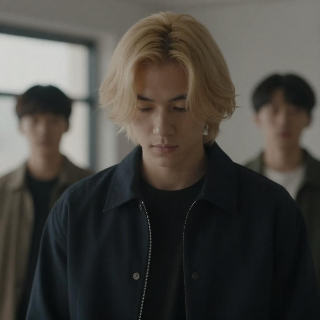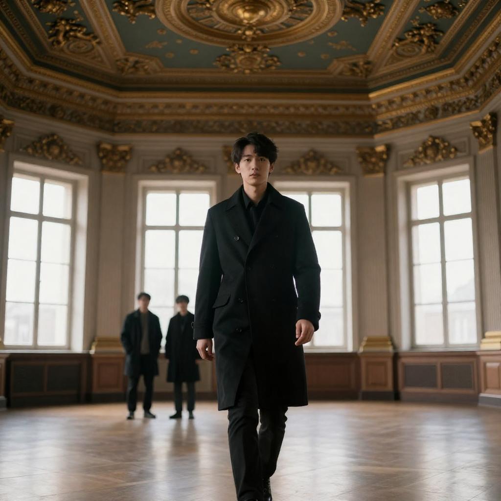 A man in a long black coat walks in a grand, ornately decorated room with gold and dark green painted ceilings, large windows, and wooden walls. Two other people stand in the background. The ceiling has elaborate, intricate designs. The room is lit by natural light from the windows. The man's expression is neutral.