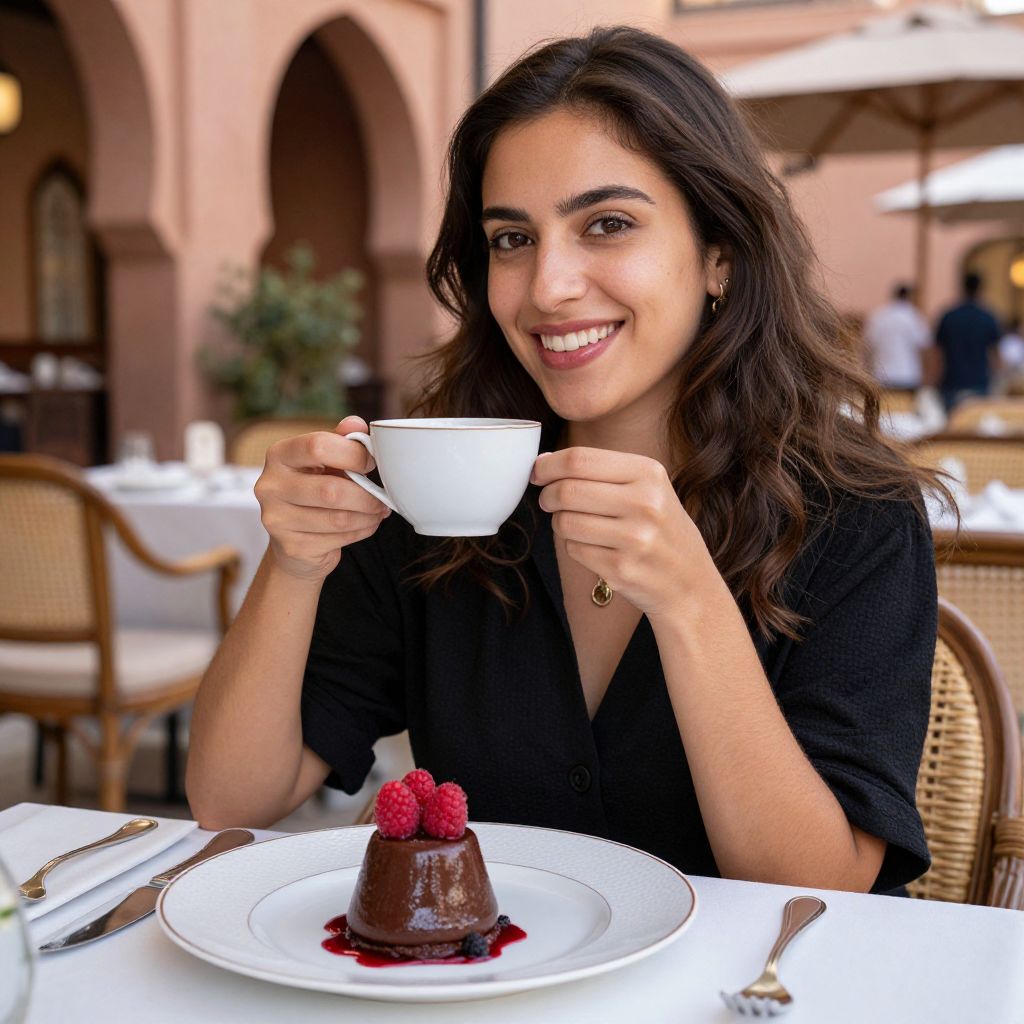 Smiling woman enjoying a moment of relaxation at Jamra restaurant, Movenpick Marrakech, as she holds a delicate white teacup while a decadent chocolate dessert topped with three vibrant raspberries rests on a plate before her.