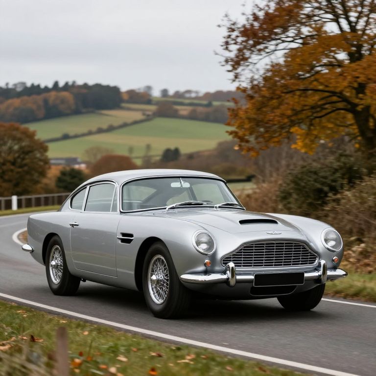 Classic Aston Martin DB5 from 1964 glides gracefully along a winding road, showcasing its sleek silver body, iconic grille, and vintage charm against a serene backdrop of autumnal trees and rolling hills.