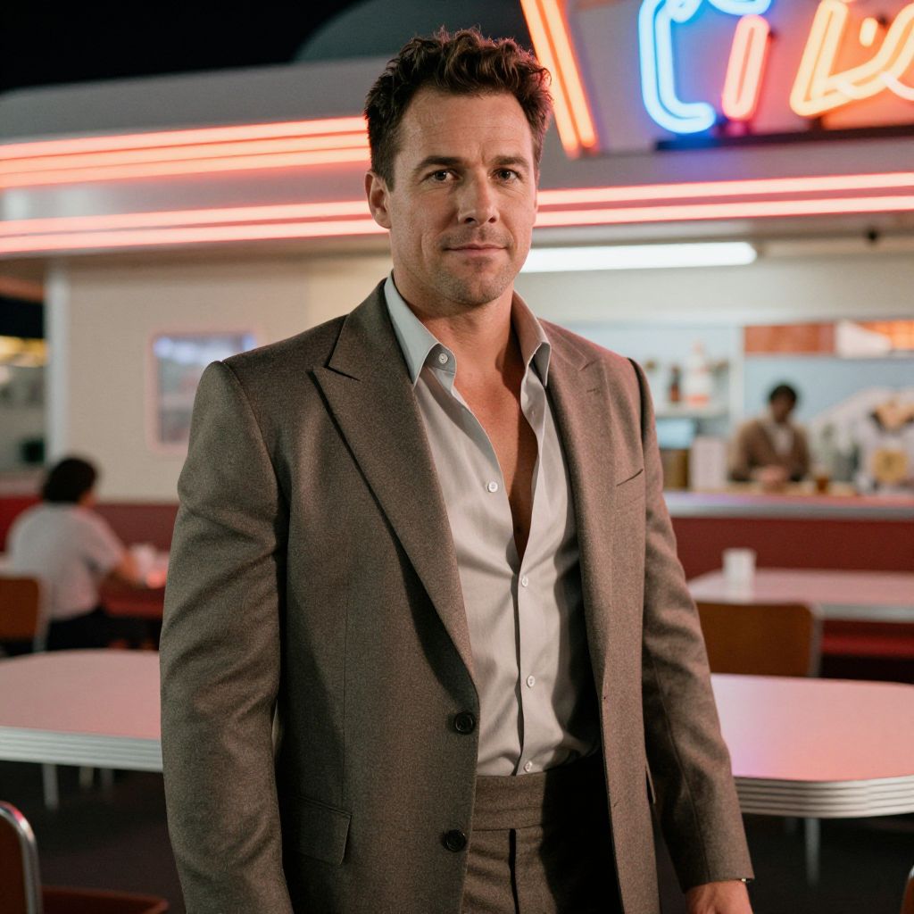 Photograph of a handsome middle-aged man with short, dark, slightly curly hair, wearing a brown checkered suit over a white dress shirt, unbuttoned at the top. He stands in a retro-style diner with neon signs in red, blue, and white in the background. The diner features red and white booths, and two people are seen seated in the background, slightly out of focus. The man's confident expression and relaxed posture convey a sense of coolness and charisma. The lighting is bright, highlighting the man's features and the vibrant colors of the diner.