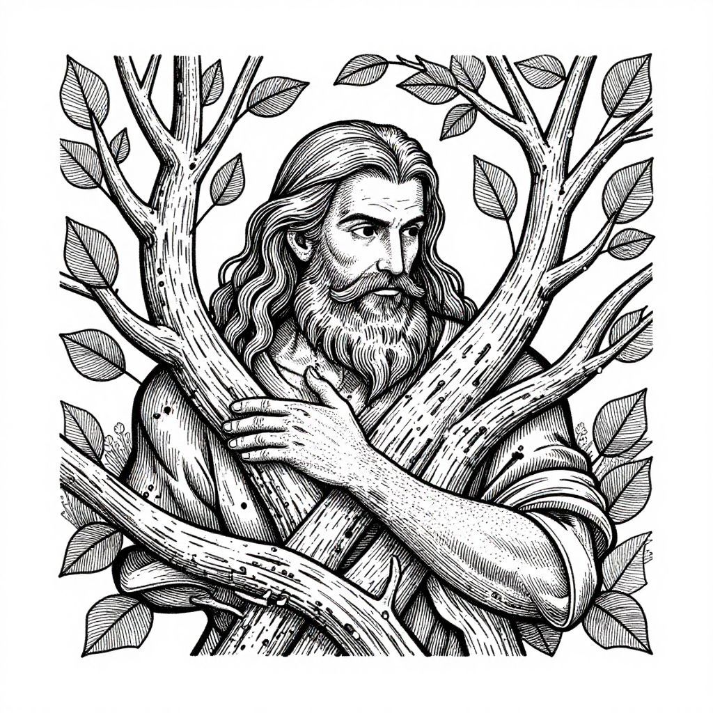 A detailed black and white drawing of a bearded man intertwined with tree branches and leaves, set against a white background, evoking the image of a forest deity.