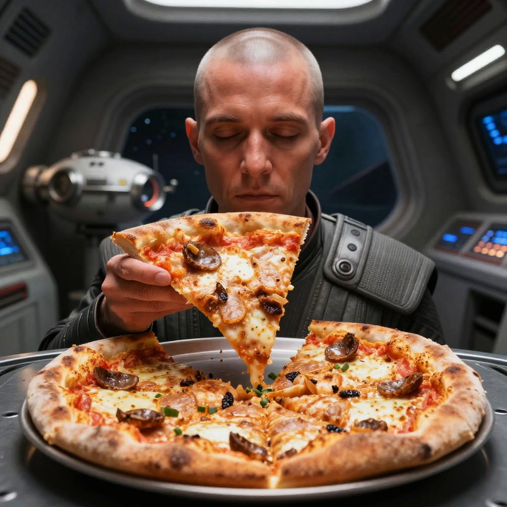 A man with smooth skin and a shaved head holds a perfect slice of cheese and mushroom pizza inside a futuristic starship interior resembling the Millennium Falcon. The man wears a detailed dark uniform with padded shoulders, eyes closed, in a moment of concentration. The high-resolution, photorealistic image shows intricate details of the pizza and the starship environment with control panels and a robot in the background.