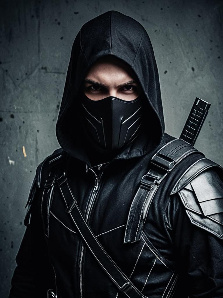Photorealistic dark portrait of a man wearing a modern assassin costume. The subject has an intense gaze with a black hooded jacket, a black mask with white angular patterns, shoulder armor, and a strap across the chest. A katana sword is visible strapped to his back. The background is dark, emphasizing the mysterious and stealthy appearance of the character.