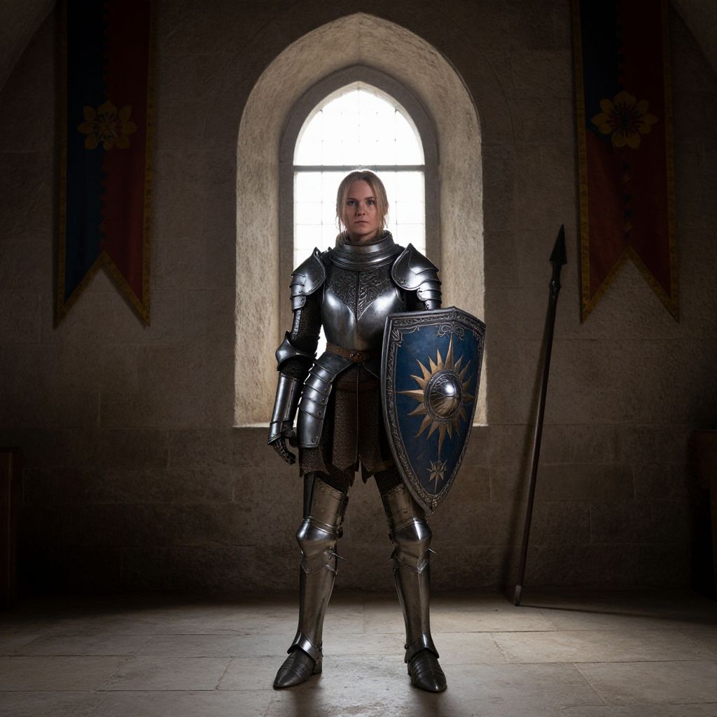 In a dimly lit, sparse medieval room, a woman stands resolutely, her armor gleaming with intricate designs. She holds a shield adorned with a sunburst pattern, its surface reflecting the faint light filtering through the arched window in the background. To her right, a spear leans against the stone wall, its blade sharp and pointed. The room is adorned with banners, their fabric hanging loosely from the wall, adding a touch of color to the otherwise muted tones. The stone archway behind her frames the window, allowing a glimpse of the outside world, where the light is brighter and more vibrant. The overall composition is balanced, with the woman's figure centrally positioned, her armor and shield creating a focal point that draws the viewer's eye. The interplay of light and shadow, combined with the detailed textures of the armor and stone, creates a sense of depth and realism in this high-quality, high-fantasy scene.