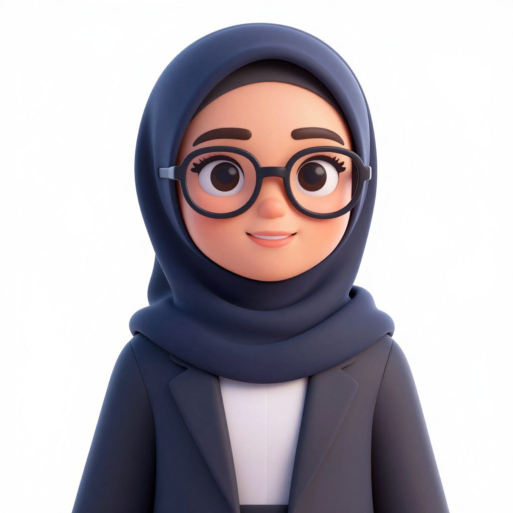 A vibrant cartoon-style illustration of a Muslim woman wearing a hijab, glasses, and a professional outfit, set against a transparent background with soft lighting effects, rendered in high-definition digital art.