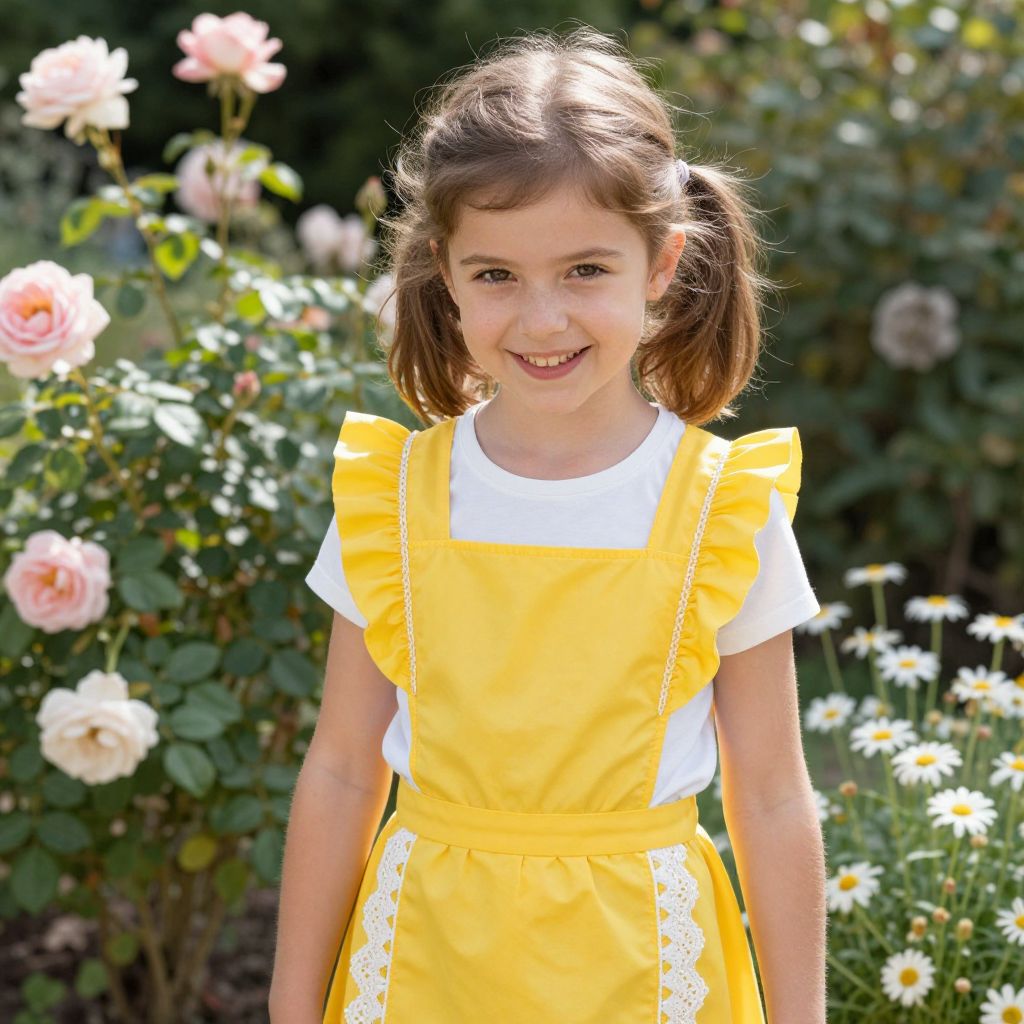 A young girl in her mid-teens wearing a bright yellow pinafore costume with lace trim, standing in a sunny garden filled with flowering roses and daisies, her soft brown hair tied in a ponytail, smiling warmly with sunlit eyes and a playful expression, the pinafore has a frilled collar and matching apron, realistic photography style, natural daylight.