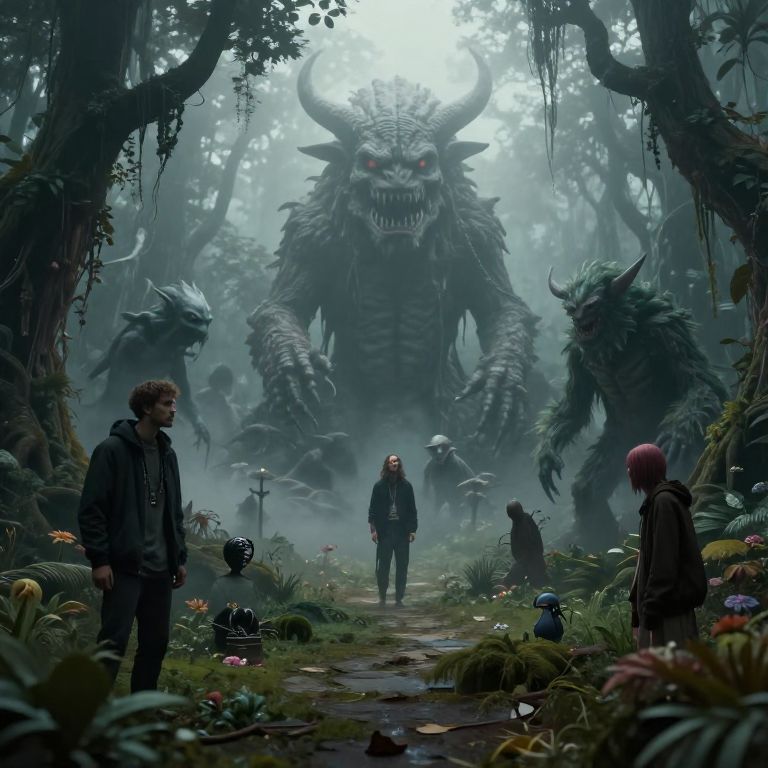Identity Hyperrealistic visualisation of hypnotic dreams about lost paradise, monsters hidden behind illusion, soul rappers hidden in backyard, spooky creatures, fog, 8K, — v 5,