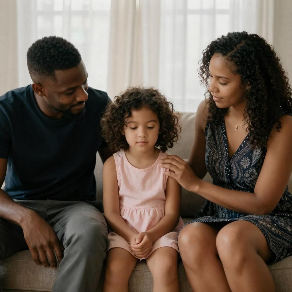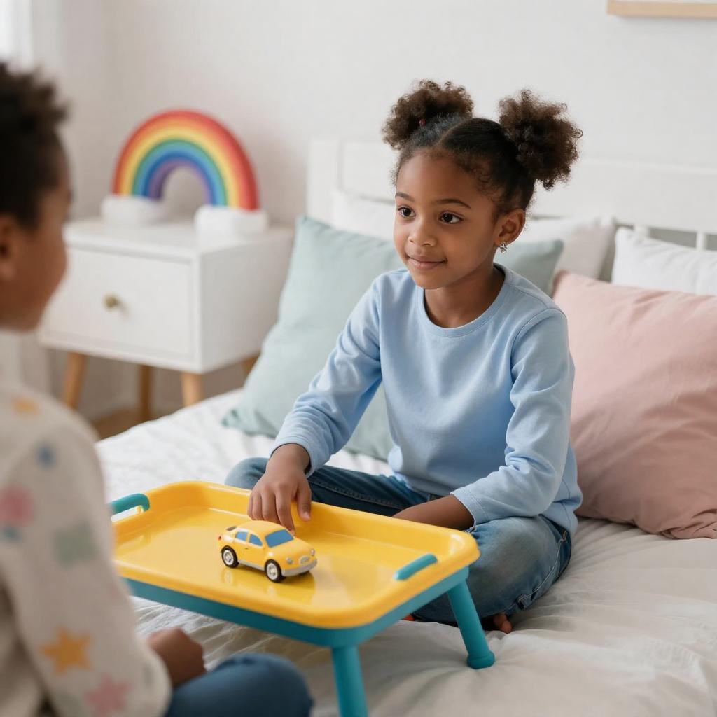 Photograph of a young Black girl with dark skin and a bun, wearing a light blue long-sleeve shirt and jeans, sitting on a bed with pastel-colored pillows. She looks at a person in a floral-patterned garment. A yellow and blue toy tray with a small toy car is on the bed. A white nightstand with a rainbow lamp is in the background.