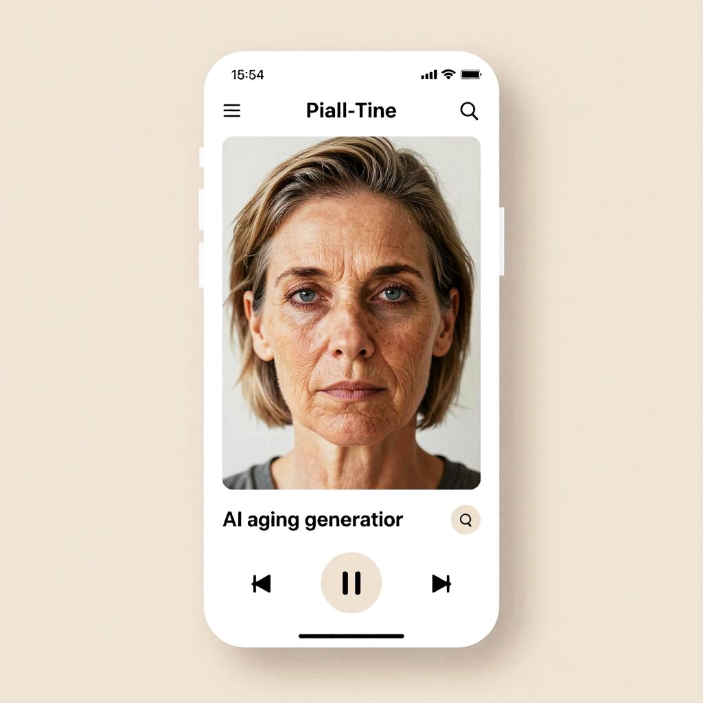 AI aging generator in action, a mobile app interface displaying real-time aging effects on a user's photo, clean minimal UI, modern graphic style, warm color palette highlighting facial wrinkles and hair color changes, realistic rendering