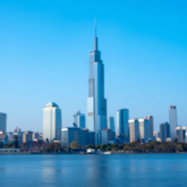 A digitally altered photograph of a city skyline with a bright blue sky and reflective water in the foreground. The buildings are slightly blurred, creating a surreal, dreamy effect. The tallest building, a sleek, modern skyscraper, is centered, surrounded by shorter structures. The image has a smooth, almost glass-like texture, with the city's lights subtly glowing against the sky.