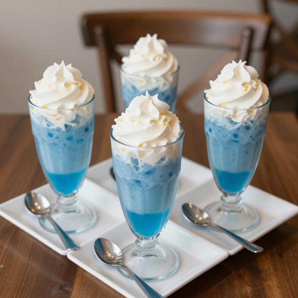 Photograph of four blue and white frozen drinks. Three tall glasses with swirled blue and white ice, topped with white whipped cream. One shorter glass with blue liquid. Each on a white square plate, with a silver spoon in the foreground. Background has a blurred wooden chair. Table is dark wood.