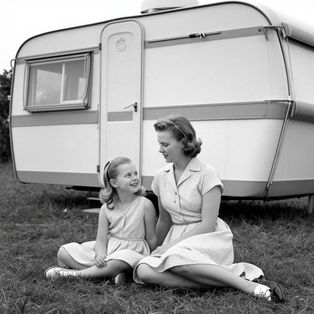 In a vintage black-and-white photograph capturing the essence of mid-century charm, a woman and a young girl sit together on the grass in front of their Corke's Meadow caravan, exuding a nostalgic and serene atmosphere that reflects the simplicity and joy of 1951.