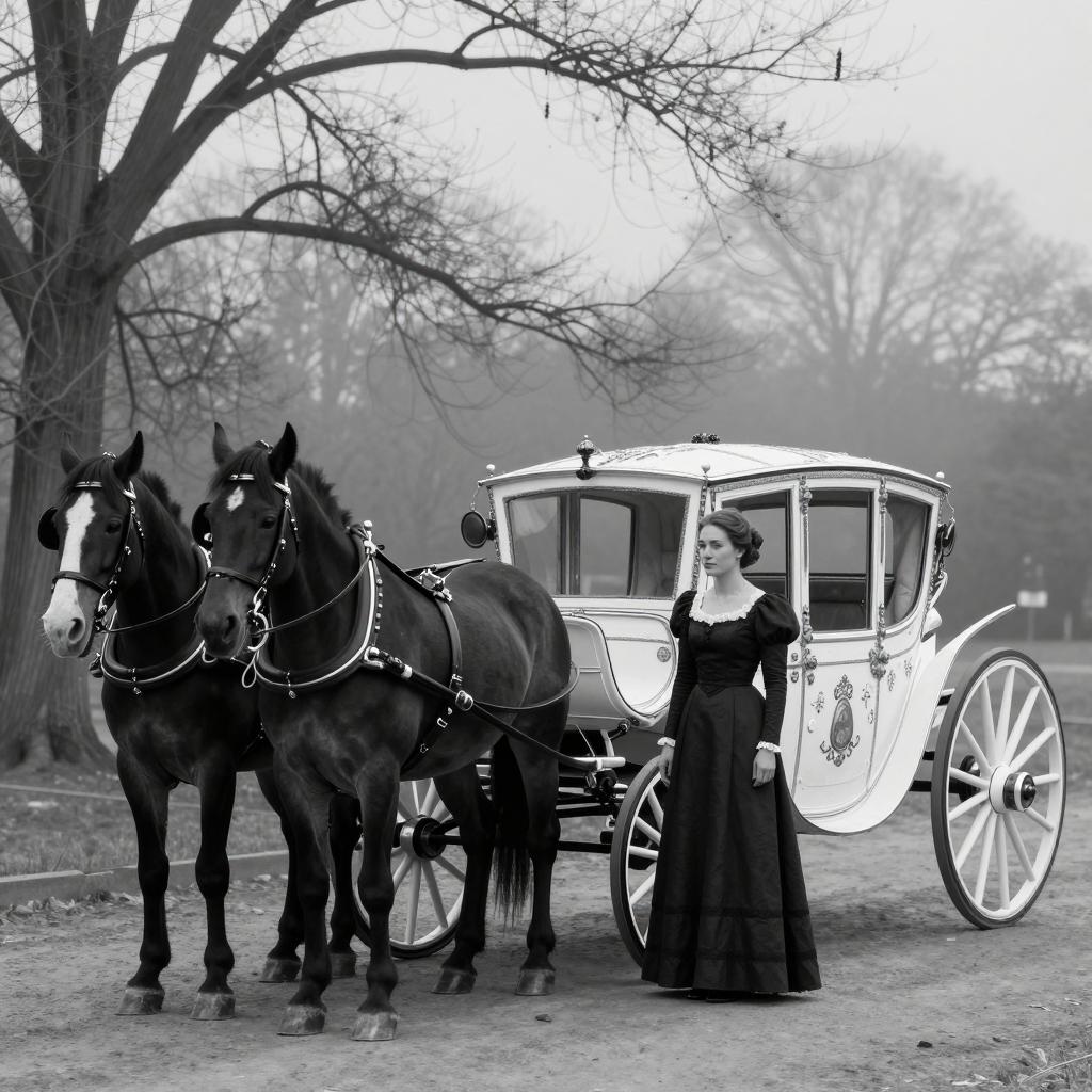Black and white photograph of a woman in a long, dark dress standing beside an ornate, horse-drawn carriage with two horses. The woman has a solemn expression, and the carriage is decorated with intricate patterns. Bare trees and fog fill the background. The horses are facing left, and the carriage is centered.