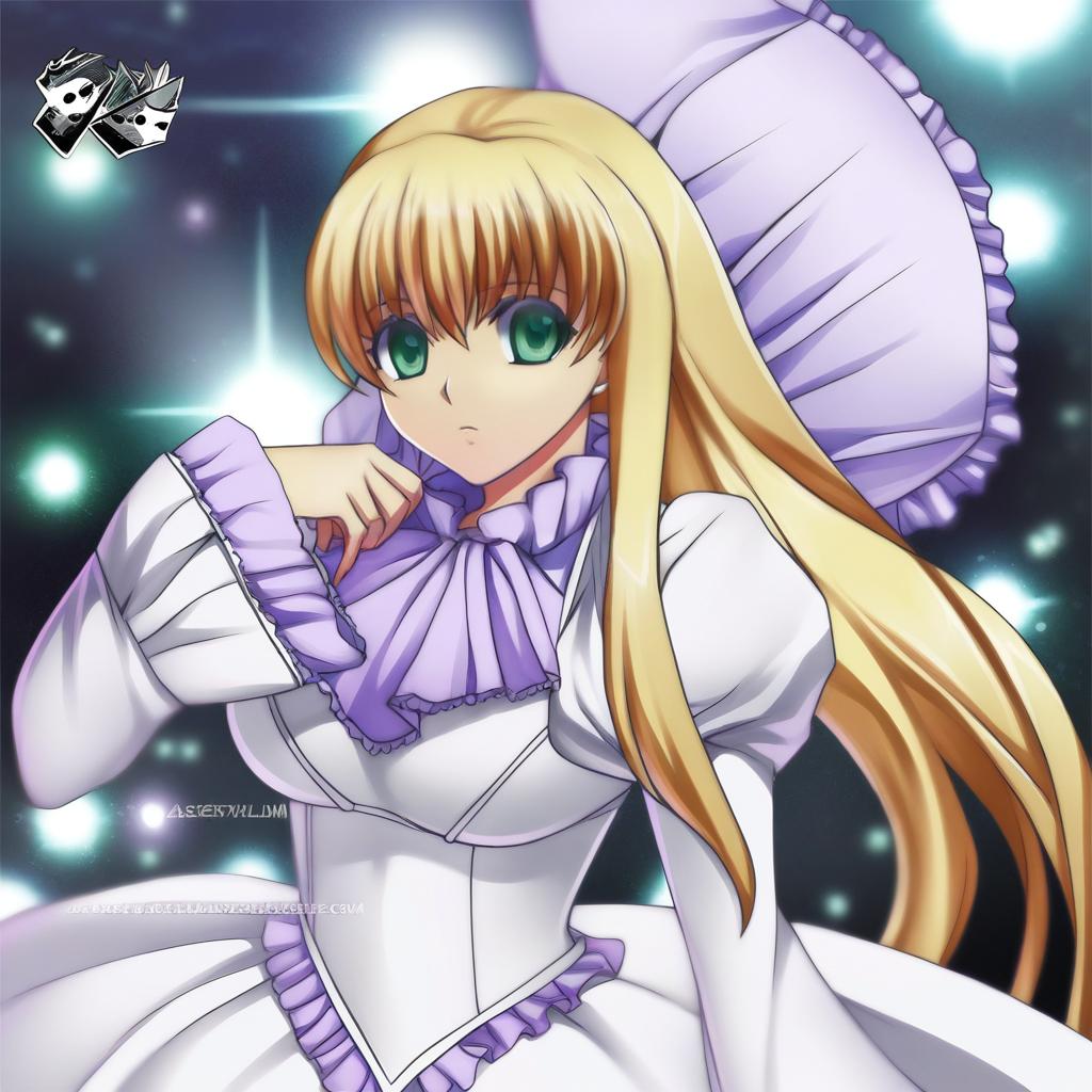 Asseylum vers allusia, aldnoah.zero, 1girl, green eyes, blonde hair, long hair, by artist jadenkaiba, leet