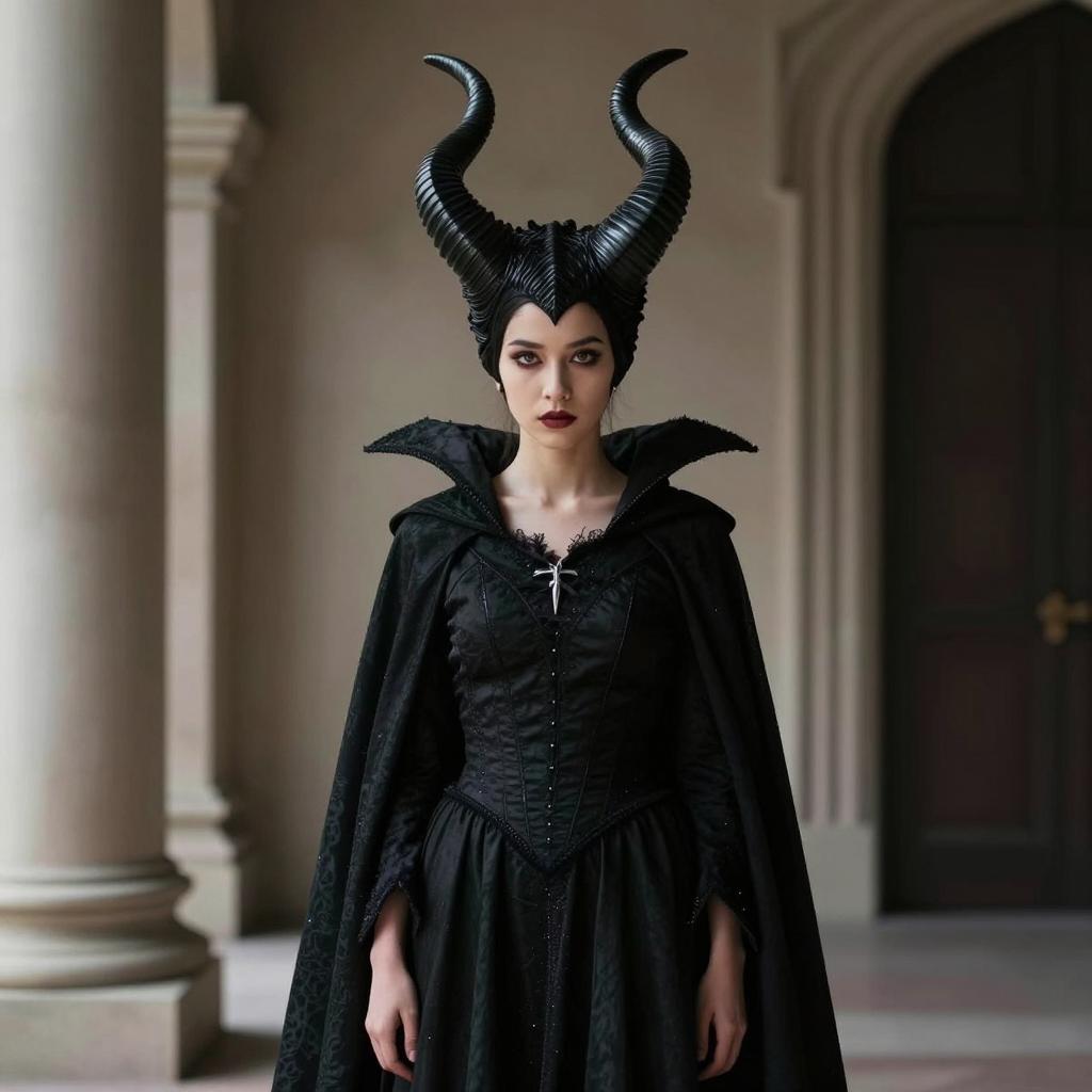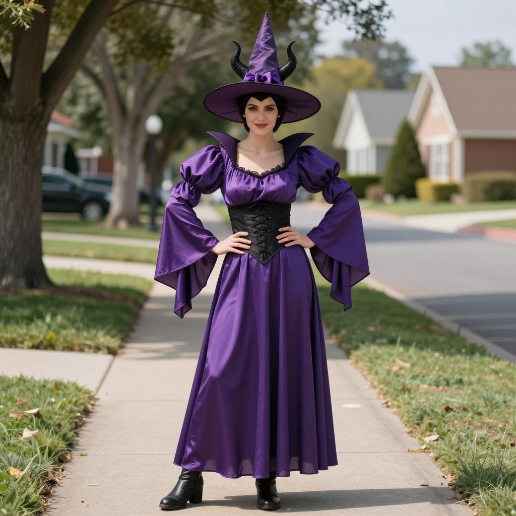 Evil disney fancy dress, photograph of a person standing on a sunny suburban sidewalk, wearing a purple and black witch costume with a pointed hat, black horns, puffy purple sleeves, black corset, and long purple skirt, black boots, daytime, background with trees and houses, realistic style, medium shot, person centered, slightly smiling, hands on hips, light shadows, summer vibes, detailed costume, realistic ures