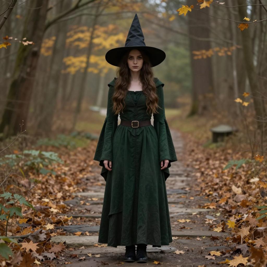 Woman in Purple Witch Costume on Suburban Sidewalk