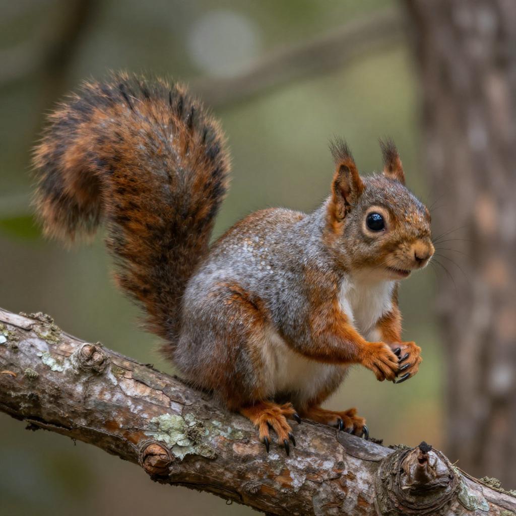 Photograph of a fluffy, brown and gray squirrel with a bushy tail, sitting on a tree branch, holding food in its paws. Bl