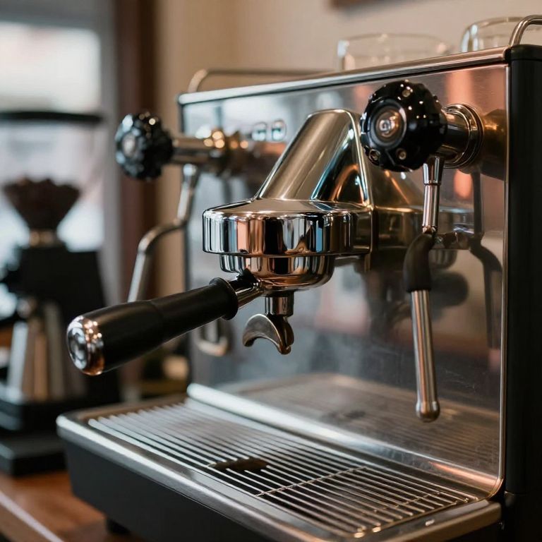 Photograph of a close-up, shiny, stainless steel espresso machine with a black handle on the portafilter. The machine features multiple control knobs and a steam wand. The background is blurred, showing hints of a wooden countertop and a coffee grinder. The espresso machine's metallic surfaces reflect light, highlighting its polished texture. The image emphasizes the machine's professional and sleek design, commonly found in cafes or coffee shops. The overall color palette includes silver, black, and brown tones.