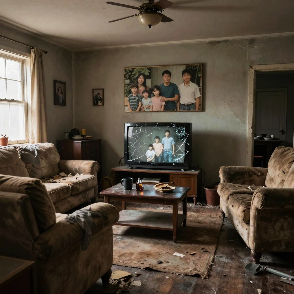 8k, realistic, vray, HDR, 6000K, on a post-apocalyptic living room, torn sofas, shattered tv, faded family photographs