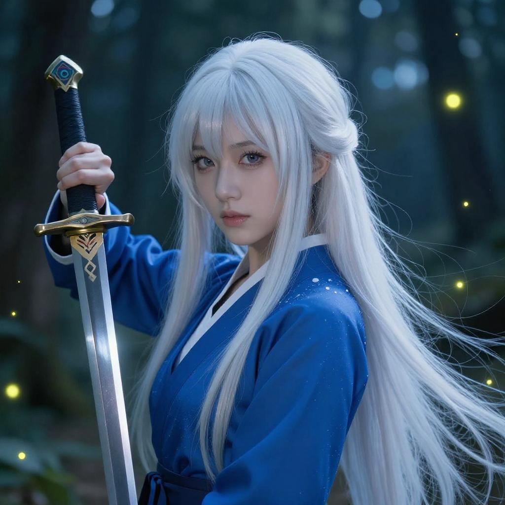 (masterpiece, best quality:1.5), asian woman with white hair, straight hair, blue clothes, holding a sword, in the style of dark azure and light azure, mixes realistic and fantastical elements, vibrant manga, uhd image, glassy translucence, vibrant illustrations, ultra realistic, long hair, portrait, mysterious forest, firefly, bokeh, mysterious, night, sky, cloud, eyes detail, beautiful eyes, light in eyes, upper body