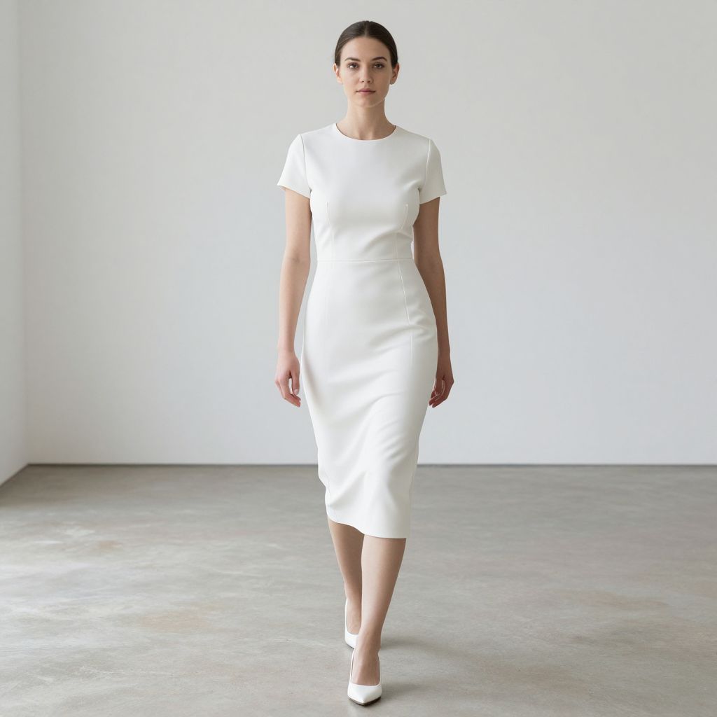 Photograph of a woman with fair skin and dark hair in a low bun, walking confidently in a minimalistic, white-walled room with a gray concrete floor. She wears a sleek, form-fitting, short-sleeved white dress that reaches just below her knees and white high-heeled shoes. Her expression is neutral, and she stands straight with relaxed arms at her sides. The lighting is soft, highlighting the simplicity and elegance of her outfit and the clean, modern setting.