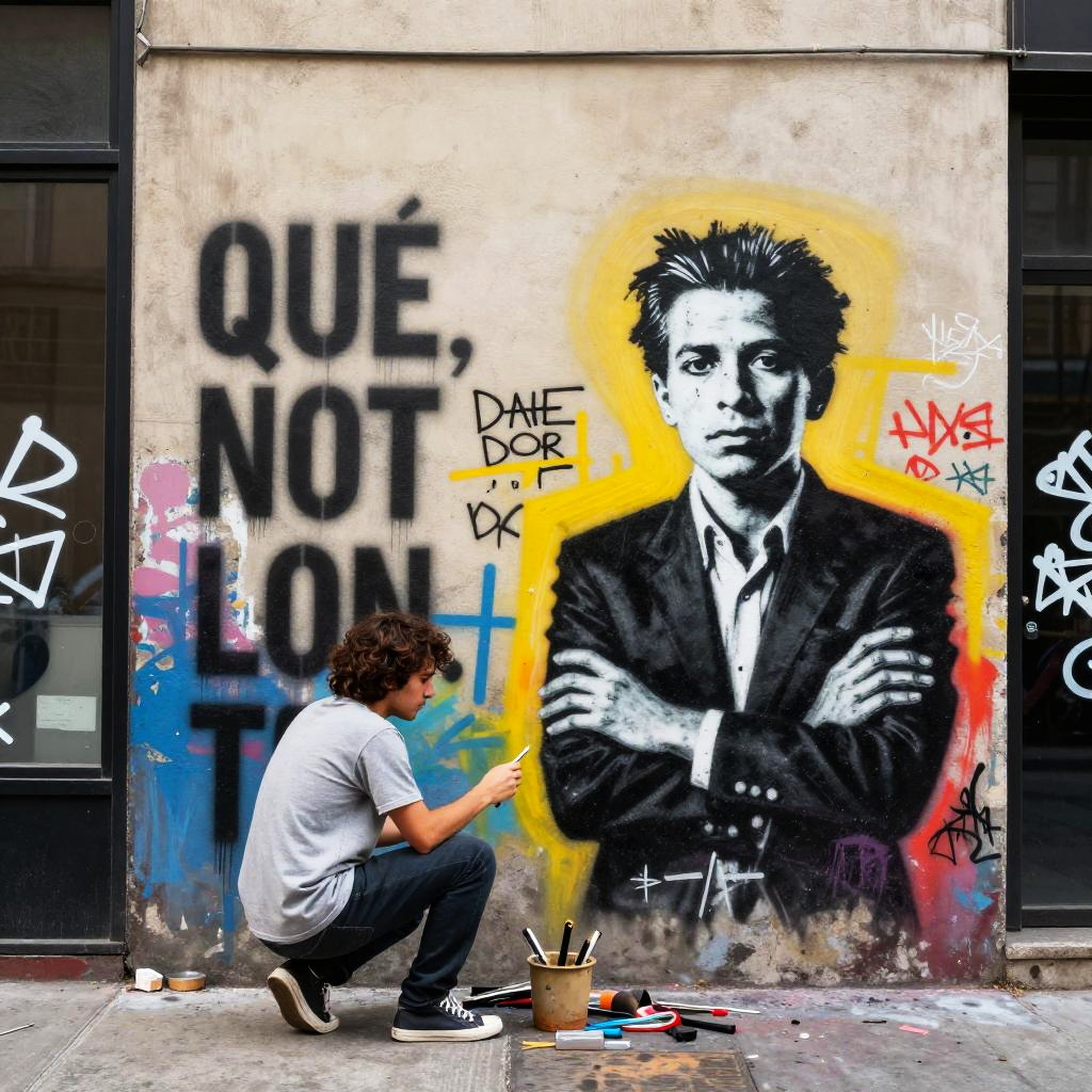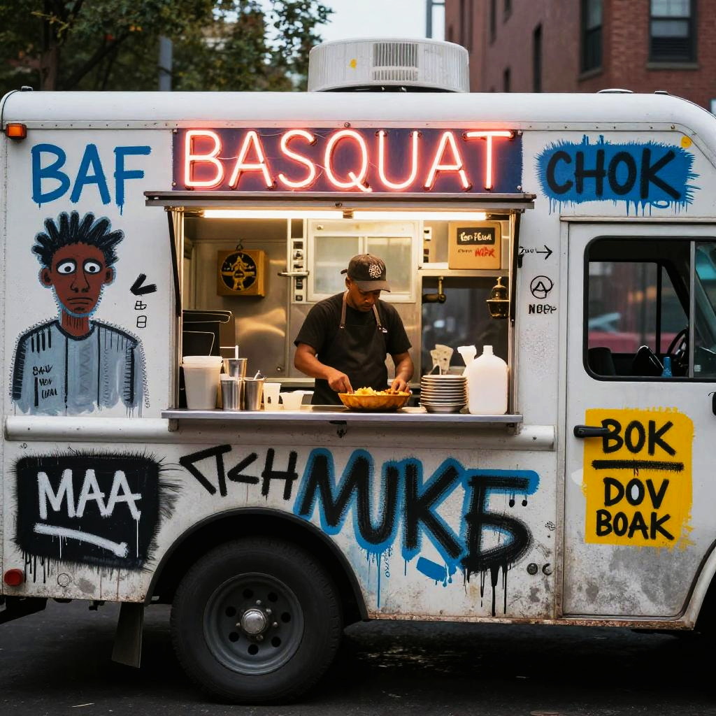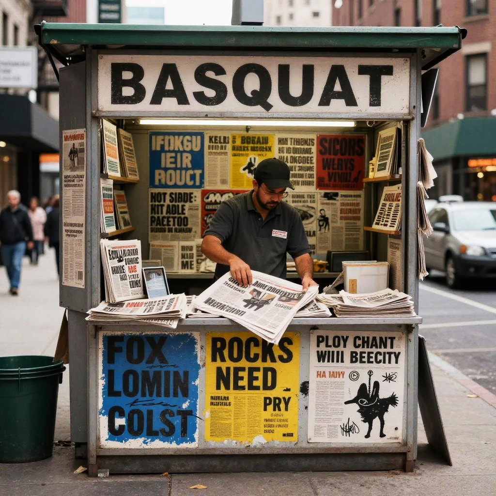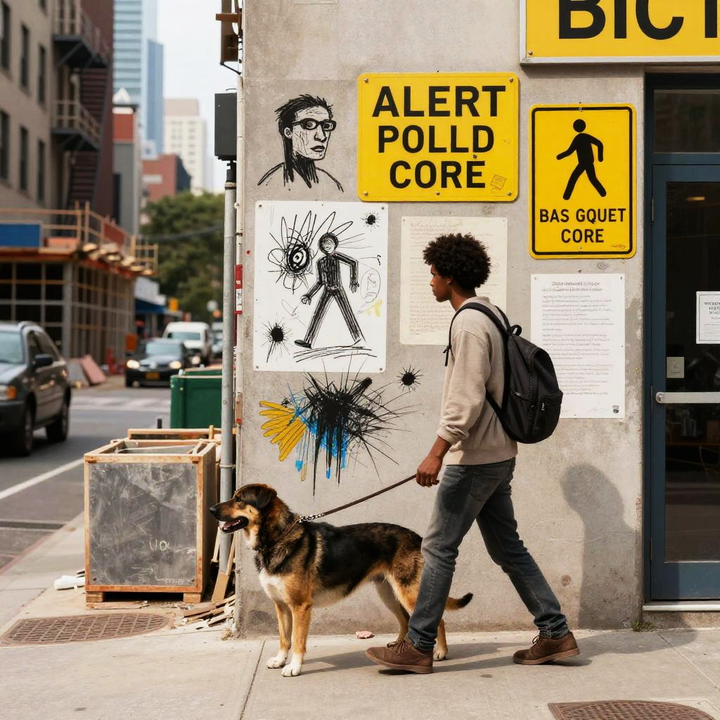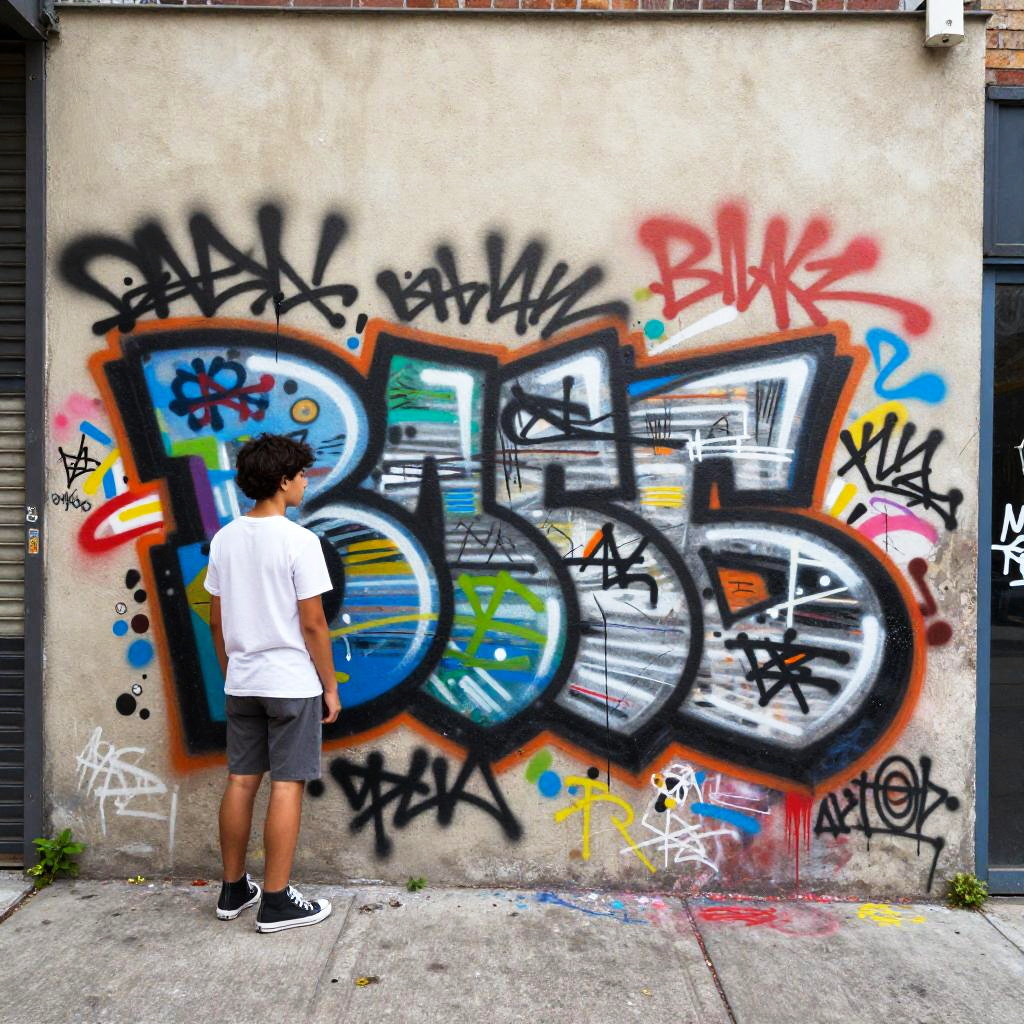 Urban scene with a teenage breakdancer performing on the corner, in the style of Basquiat, incorporating energetic tag clouds and urban slang, layered with bold colors and a raw, unpolished aesthetic.