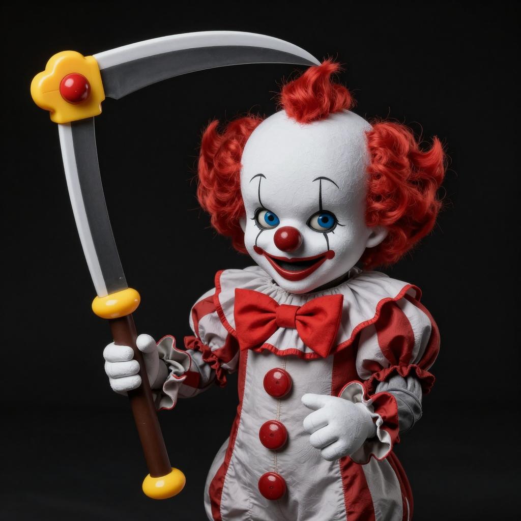 A creepy doll with red, messy hair, blue eyes, and a grimace, holding a white clown head with red nose and mouth between two large, silver scissors. The doll wears a multicolored striped shirt. The background is solid black, highlighting the doll and scissors. The doll's hands grip the top of the scissors. The clown head is centered between the scissors. The image uses dramatic lighting, with the doll's face in the shadow.