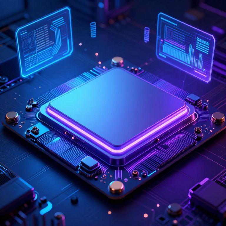 Photograph of a glowing, blue-lit, square CPU chip with a purple neon edge, centered on a dark, circuit board. The chip is surrounded by small, metallic, circular components and intricate, blue LED lines. Two holographic, blue screens displaying code and circuit diagrams float above the chip. The background is a detailed, blurred circuit board, enhancing the high-tech, futuristic aesthetic. The image emphasizes the advanced, digital technology and sleek design.