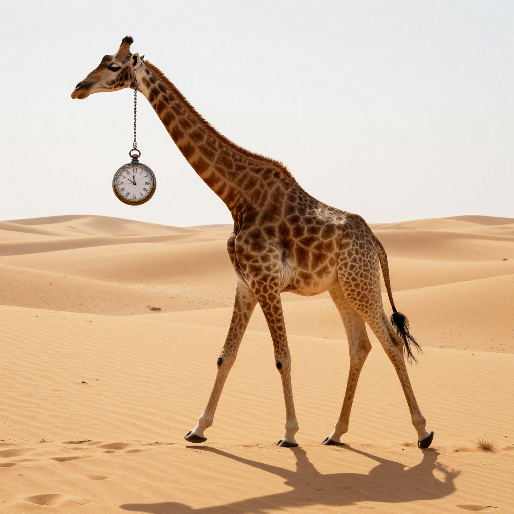 Photograph of a giraffe walking in a desert, holding a vintage clock in its mouth, with golden sand dunes in the background.