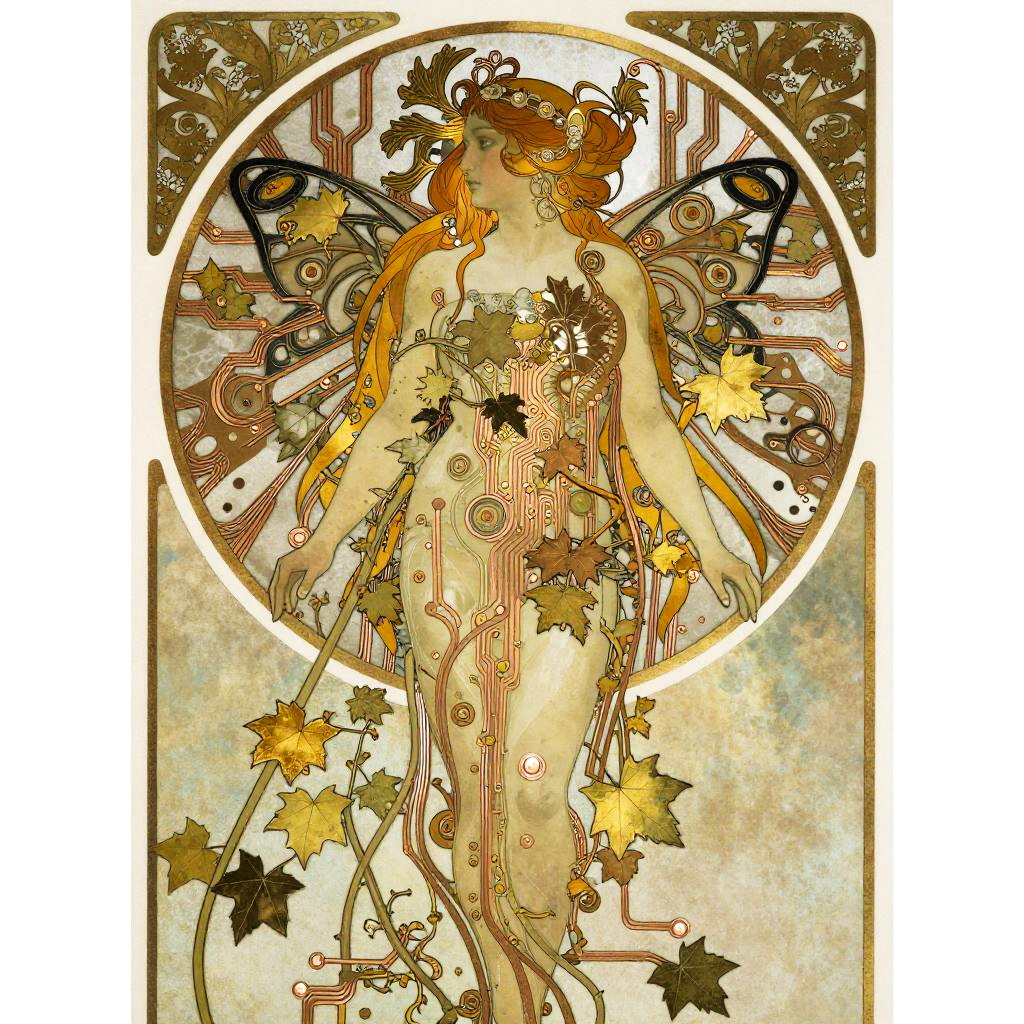 Inspired by the works of Alphonse Mucha, a mechanical nymph adorned with ornate black-and-gold filigree woven with copper circuit traces and ivy, illustrating the seamless connection between nature and technology in a captivating art nouveau style.