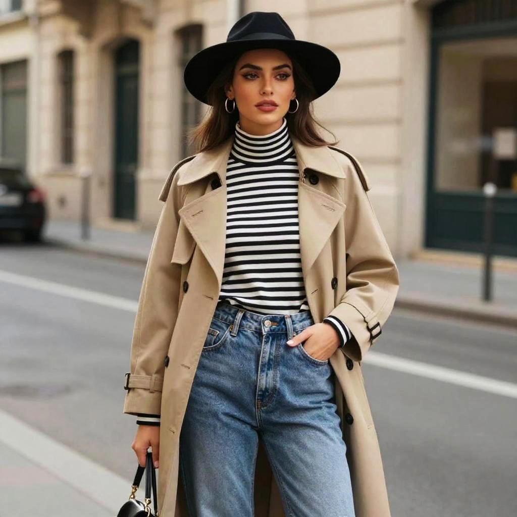 A stylish young woman stands confidently on a city street wearing a beige trench coat draped over her shoulders, paired with a black and white striped turtleneck, high-waisted jeans, and a black wide-brimmed hat. The image captures an urban street style vibe with a focus on chic, casual fashion.