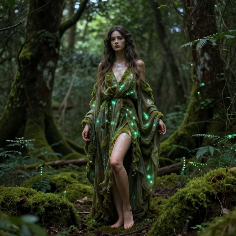 Photograph of a mysterious woman in a glowing, moss-covered forest dress, standing barefoot among glowing green lights, surrounded by dense, dark greenery