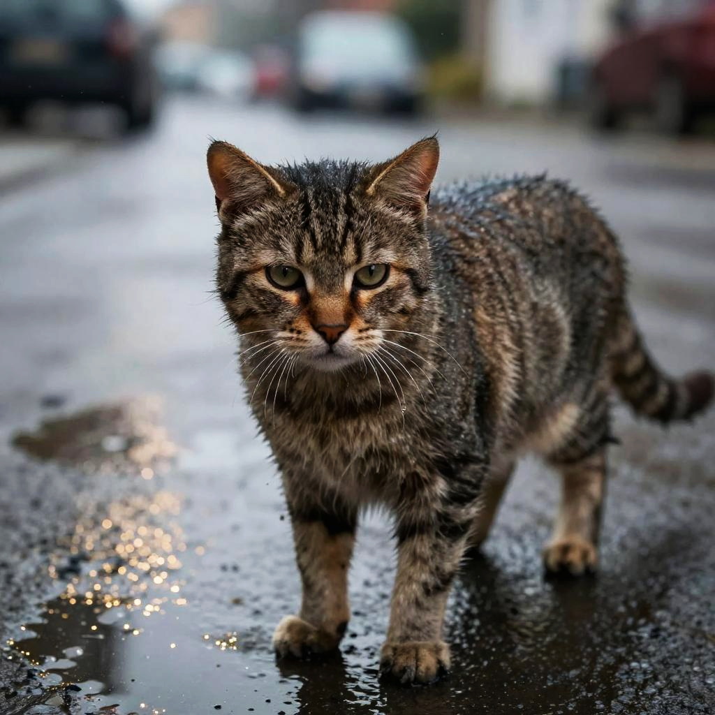 Sad wet cat with dripping fur, standing by a puddle on a rainy street, reflections shimmering, gloomy ambiance, soft focus with emotional depth, realistic fur and water effects