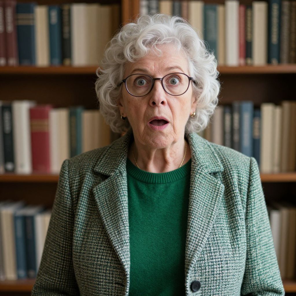 An elderly woman with curly white hair, wearing glasses, a green sweater, and a tweed suit, stands in front of a bookshelf filled with books, appearing surprised or shocked.
