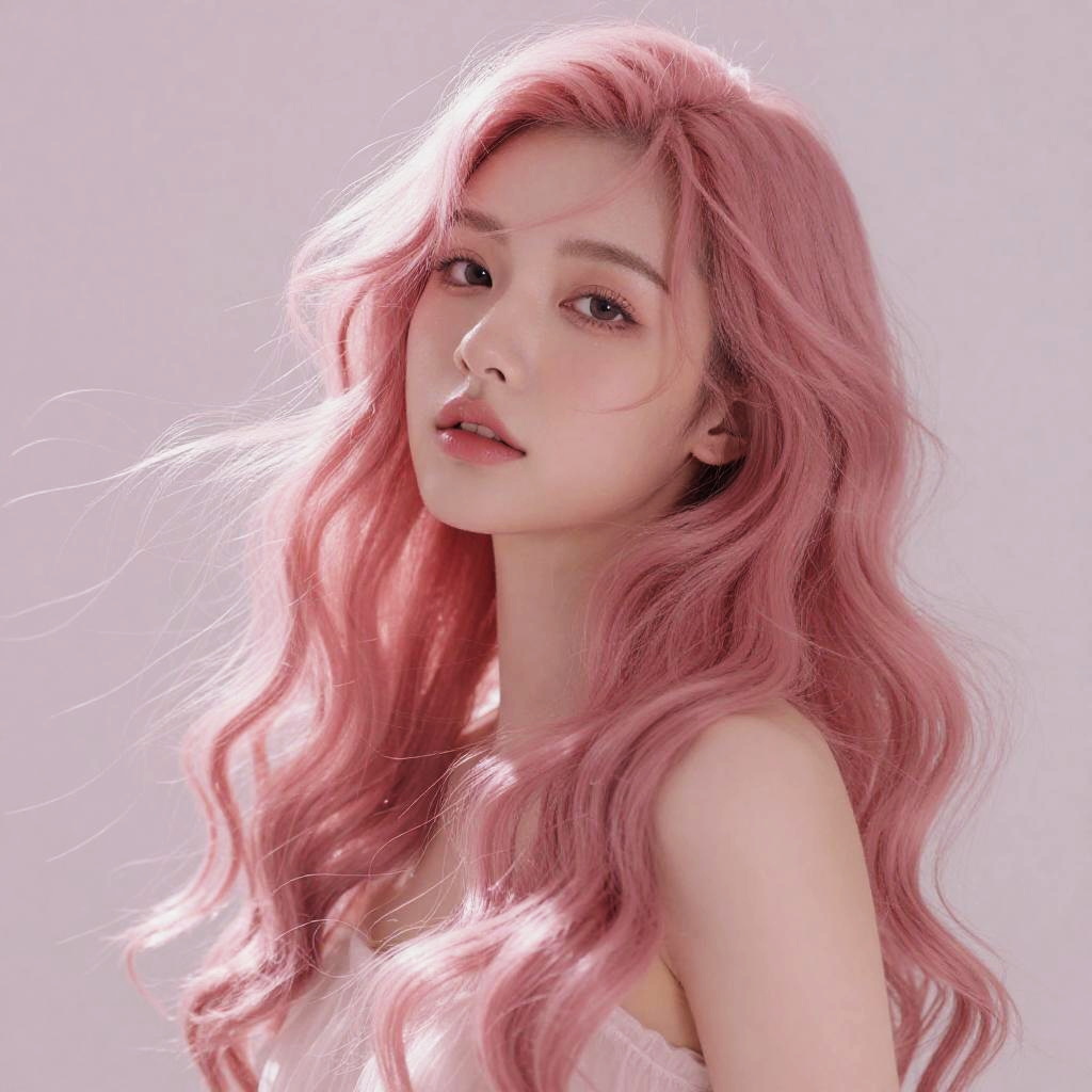 Portrait of a woman with pink wavy hair flowing in the wind, soft pastel background, ethereal and dreamy atmosphere, detailed texture, soft lighting, fantasy style