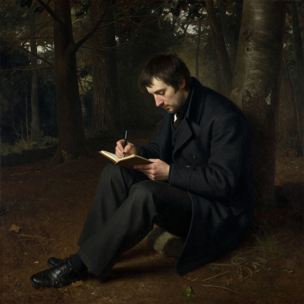Photograph of a young white man with short dark hair and a beard, sitting on the forest floor at night. He is dressed in a black coat and pants, with black boots. He is focused on writing in a small notebook held in his lap, using a pen in his right hand. The background is dark, with tall trees and sparse underbrush, illuminated by dim moonlight. The ground is covered in leaves and small twigs. The overall mood is somber and reflective, with the dark, shadowy forest adding a sense of solitude.