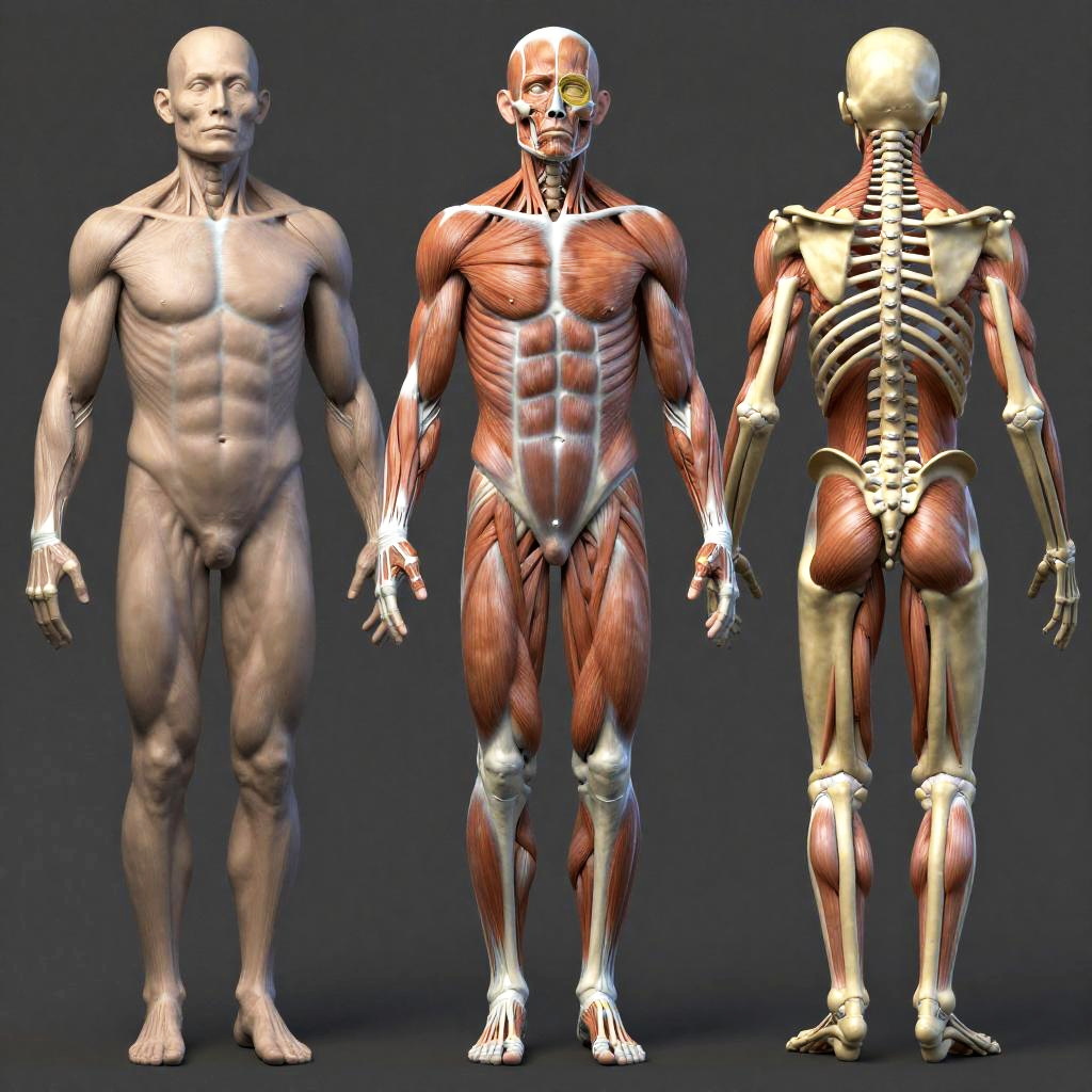 3d model references showing detailed human anatomy, muscles and bones highlighted, realistic textures, neutral background, professional artist's studio lighting